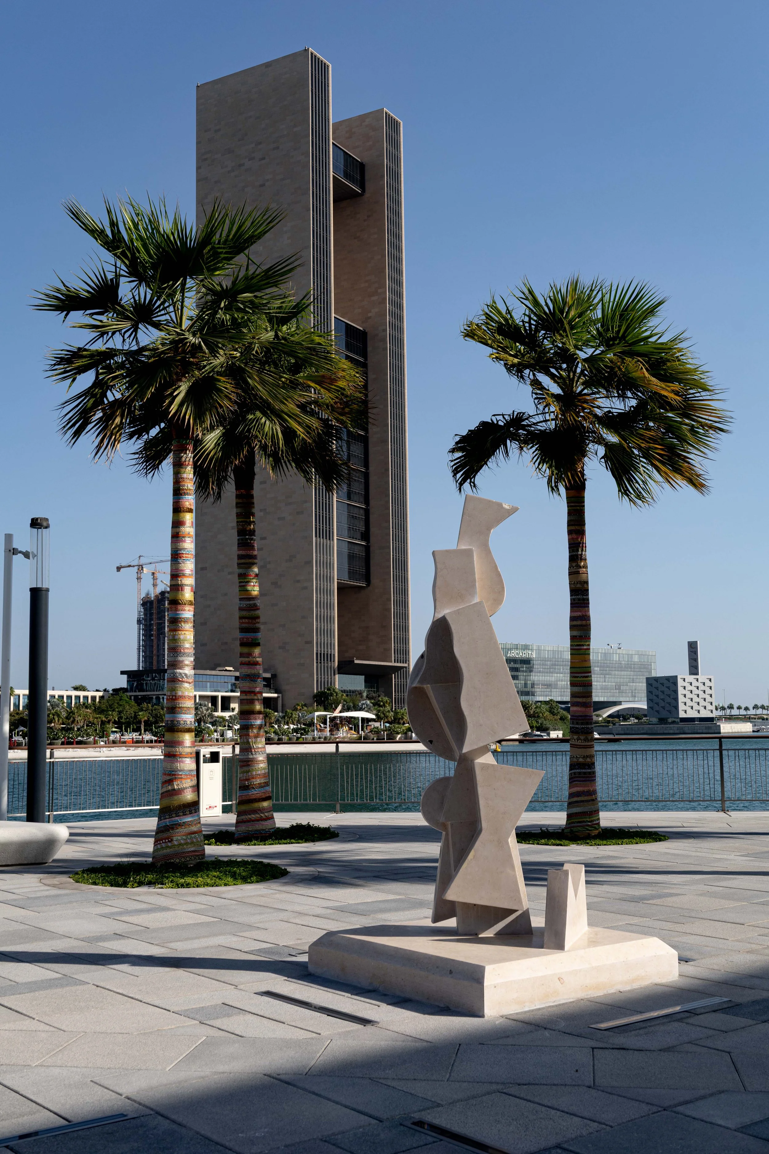 Our proposal is tailored to create a dynamic public art piece Along the waterfront promenade, sculptural forms mark the walk like anchors and waypoints. Their silhouettes are abstract, but their presence is grounded—human-scaled monuments in conversation with sky, palm, and water. By day, they read as clean lines against the horizon; by dusk, they become figures of stillness in a moving landscape.