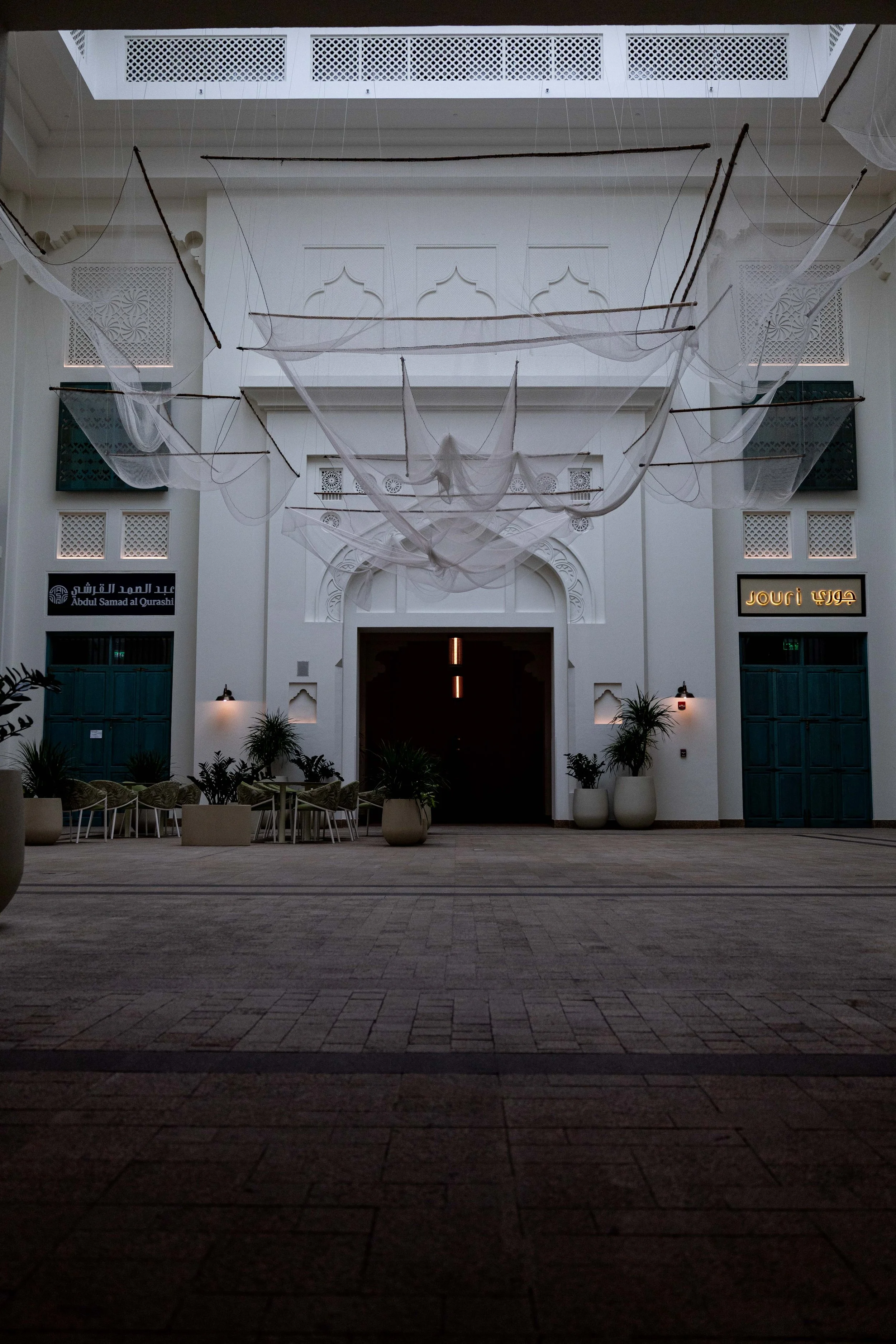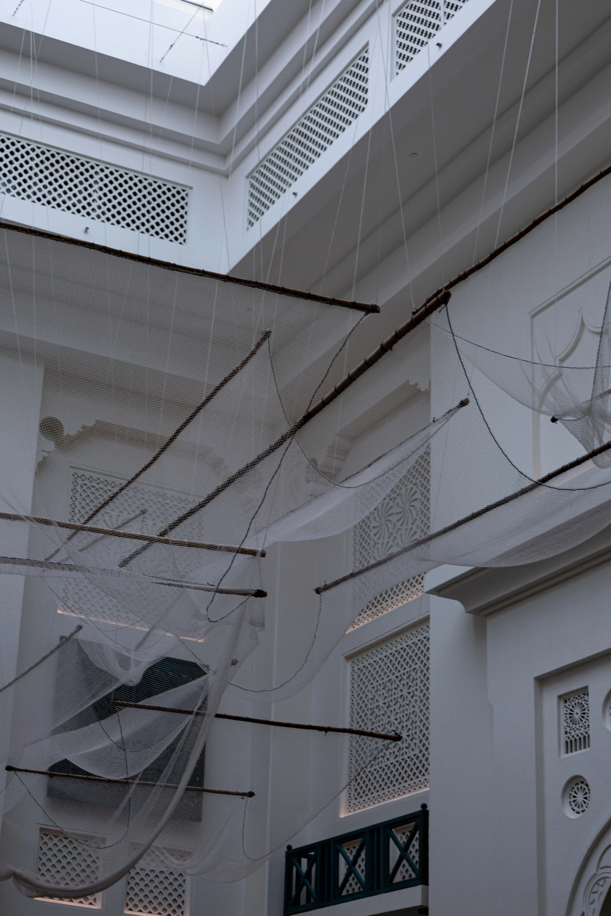 The work draws on Bahrain’s coastal memory: fishing, pearl diving, and the quiet endurance of those who lived by the water. Here, that heritage isn’t illustrated; it’s felt. Beneath the nets, the courtyard becomes a threshold between land and sea—an atmosphere of calm that invites people to slow down and look up.