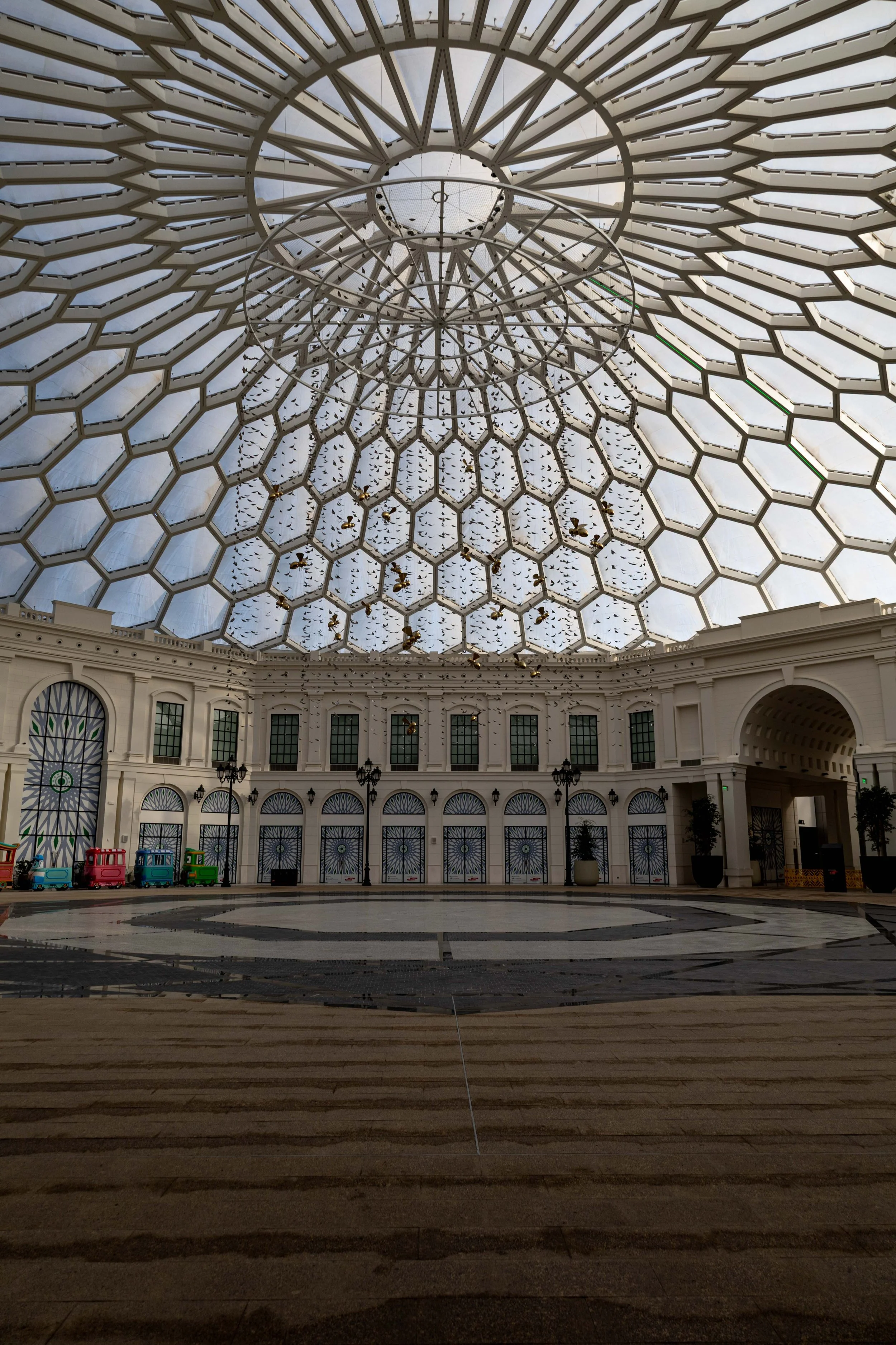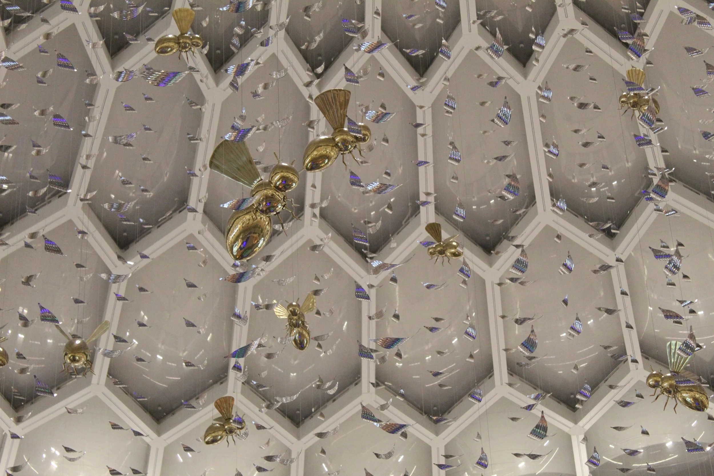 Suspended within the lattice, the bees appear mid-flight: small, luminous presences that animate the void and draw the eye upward. More than ornament, they become a living metaphor for collective energy — a reminder that the most vibrant places are shaped by movement, purpose, and shared work.