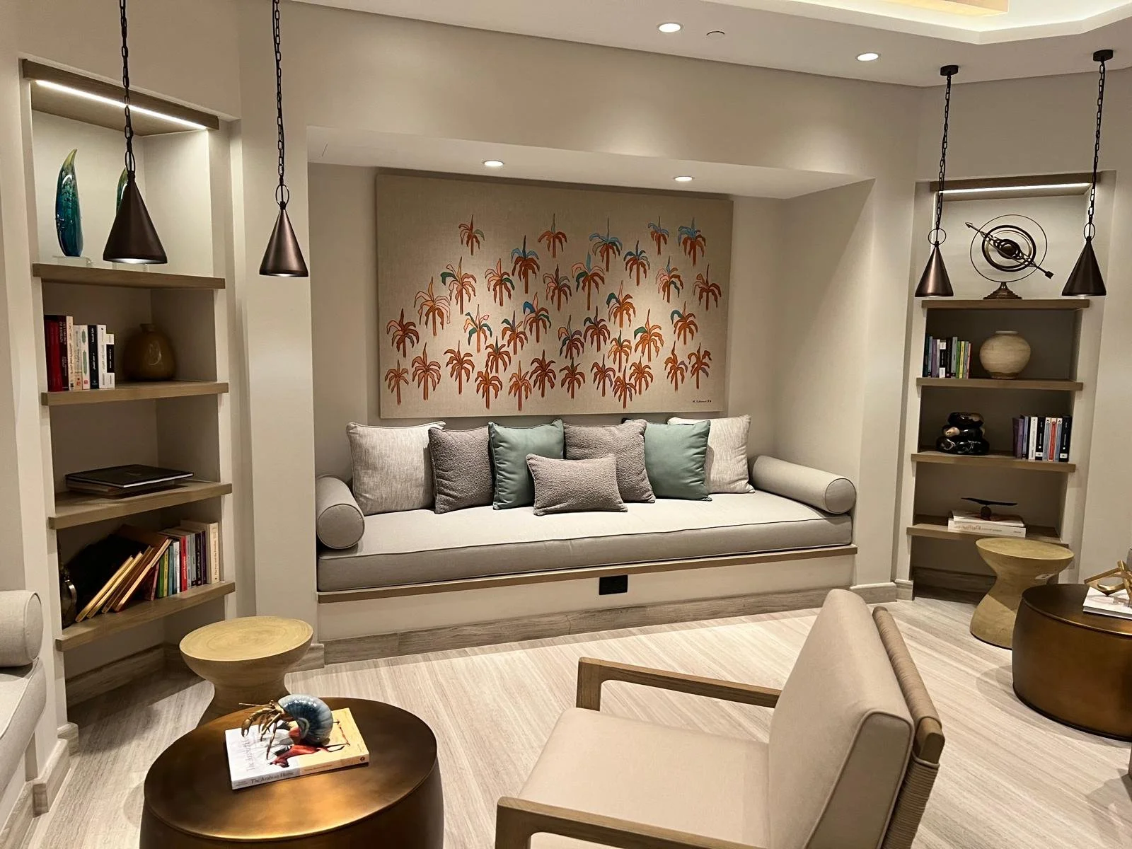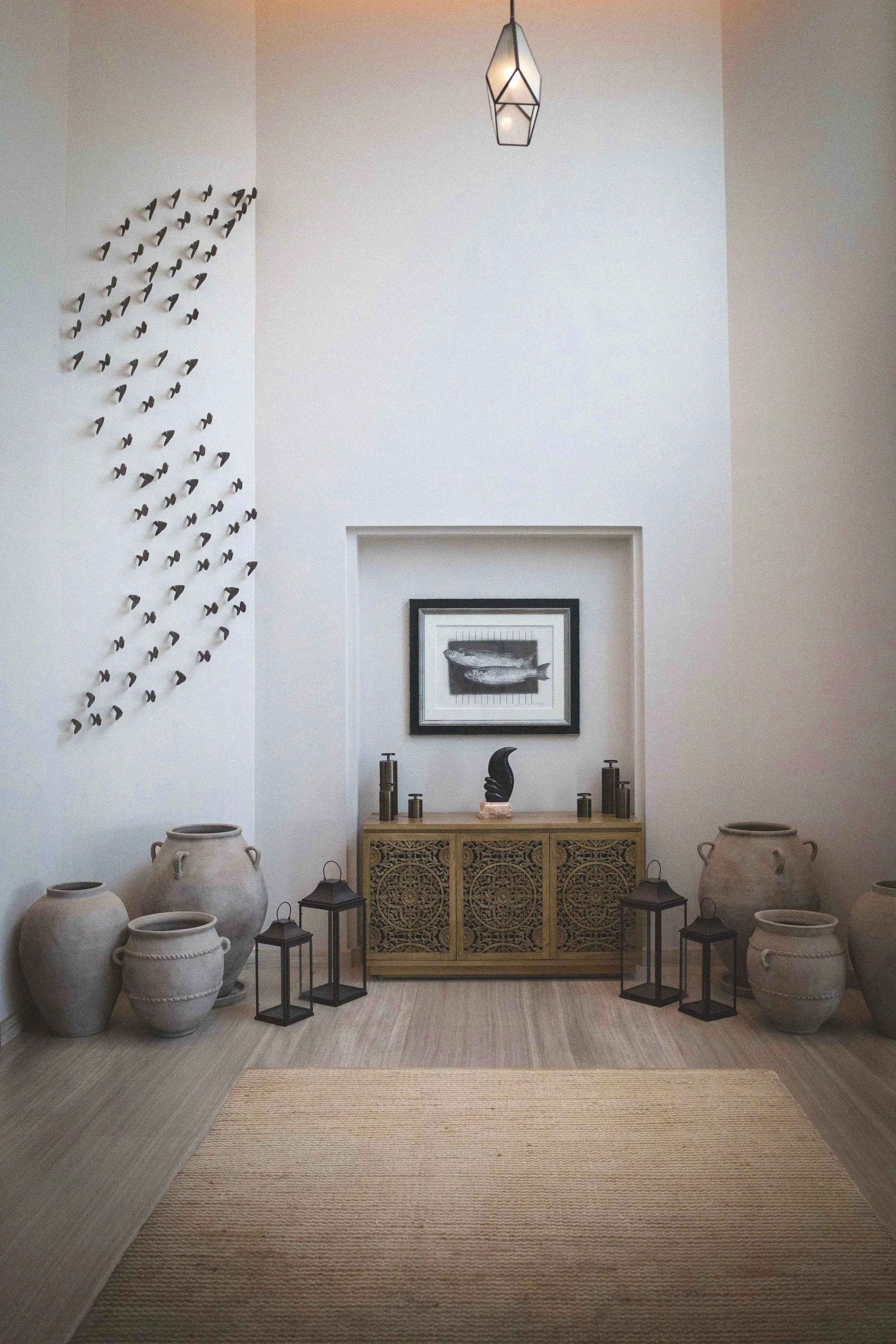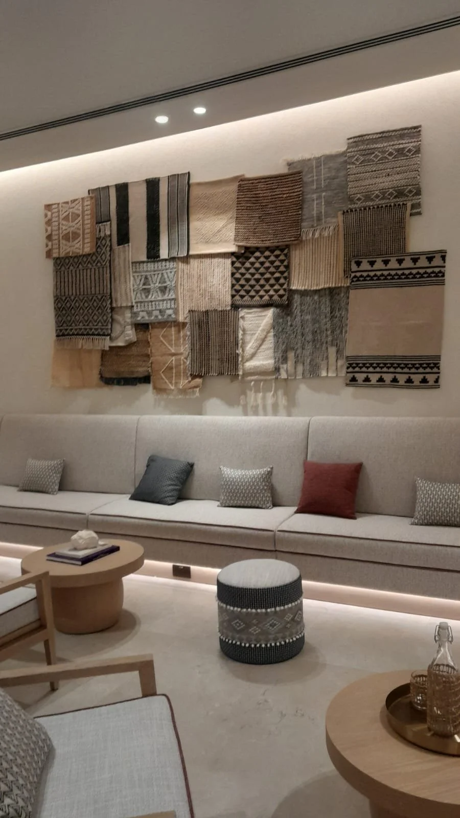 Hand-woven elements, palm-fiber baskets, pearling references, and coastal motifs reappear in different languages: a flock of wall-mounted forms that feels almost in motion; layered textiles that soften and warm modern interiors; crafted objects that ground spaces in the island’s rhythms. The result is a cohesive visual thread — subtle, tactile, and unmistakably local — woven into the resort’s everyday life.
